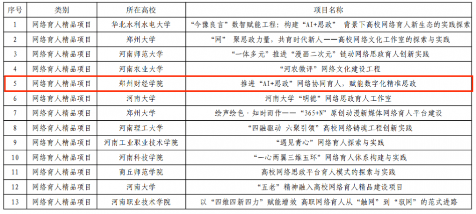 近日,中共河南省委教育工委、河南省教育厅公布2025年河南省高校思想政治工作质量提升综合改革与精品建设项目入选名单,我校党委宣传部部长杨建伟主持申报的《推进“AI+思政”网络协同育人,赋能数字化精准思政》项目成功入选网络育人精品项目,实现我校思想政治教育工作新突破。